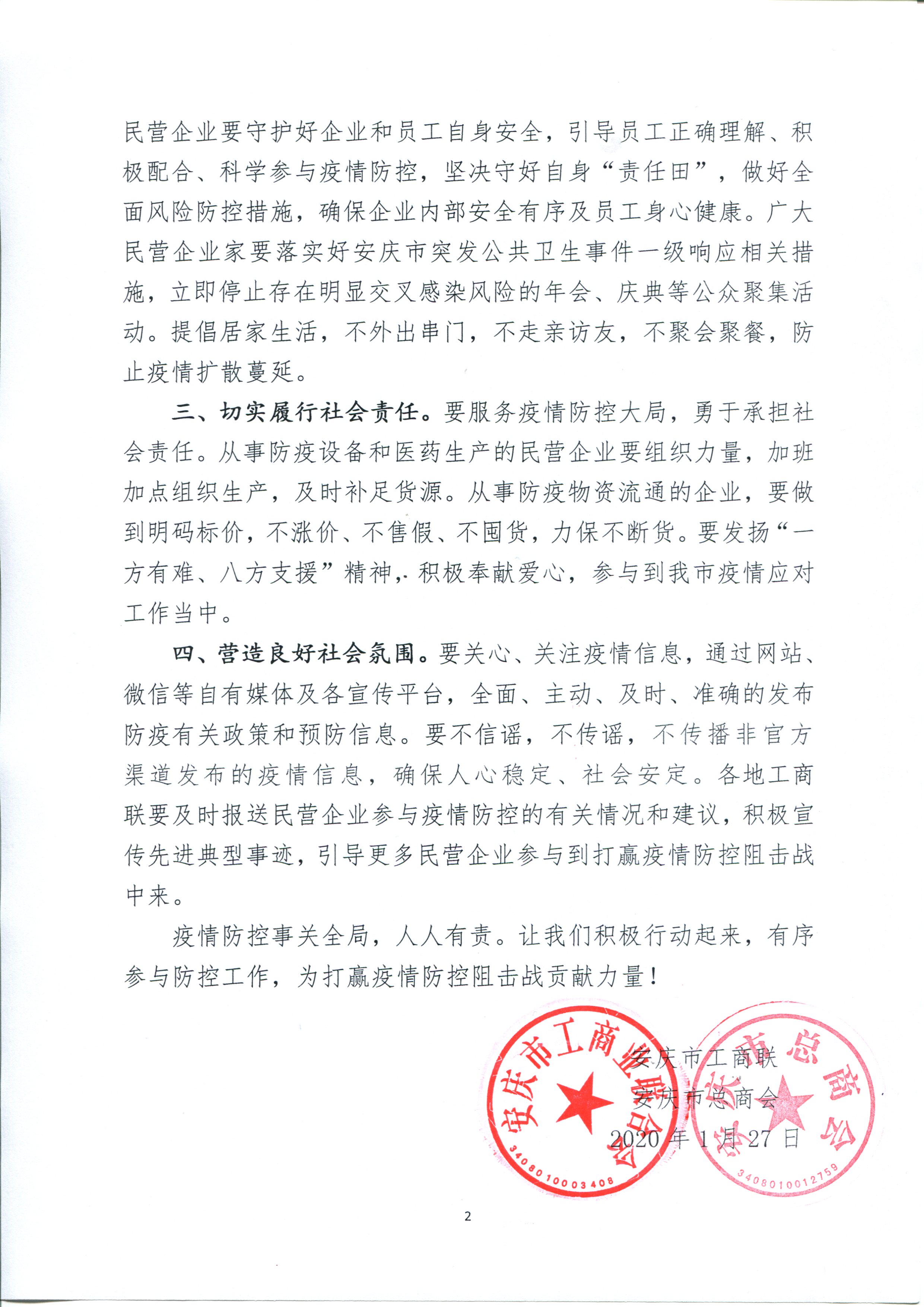 一、高度重視疫情防控。習(xí)近平總書記指出:疫情就是命令,防控就是責(zé)任。要把疫情防控作為當(dāng)前最重要的工作來抓,扎實做好學(xué)習(xí)貫徹和組織、工作準(zhǔn)備,在當(dāng)?shù)攸h委和政府統(tǒng)一指揮下迅速行動,有序參與疫情防控工作。各地工商聯(lián)要以臨戰(zhàn)狀態(tài)立即投入工作,迅速上崗到位,加強與所在地疫情防控指揮部聯(lián)系溝通,抓好職責(zé)任務(wù)落實。