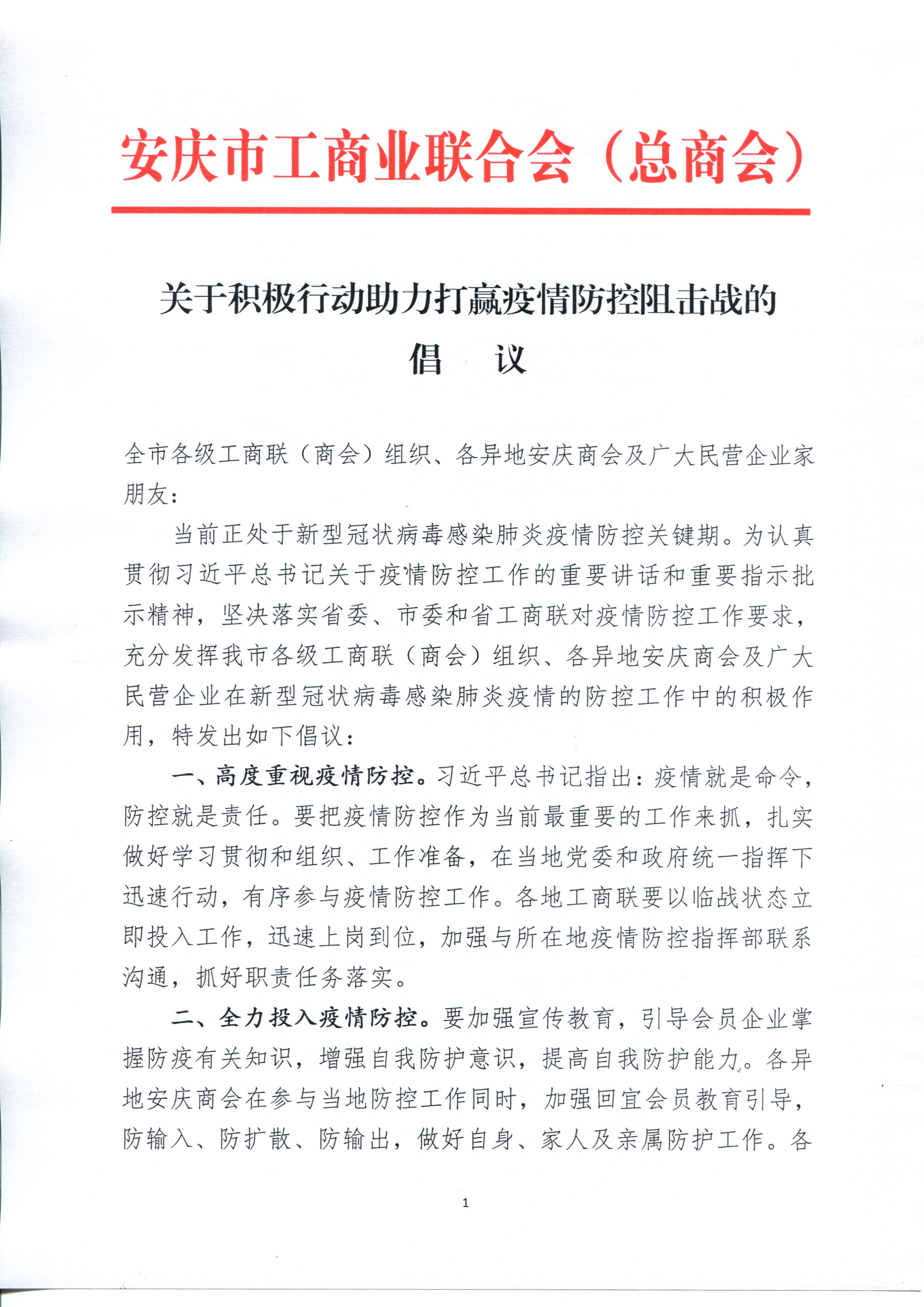 當(dāng)前正處于新型冠狀病毒感染肺炎疫情防控關(guān)鍵期。為認(rèn)真貫徹習(xí)近平總書記關(guān)于疫情防控工作的重要講話和重要指示批示精神,堅決落實省委、市委和省工商聯(lián)對疫情防控工作要求,充分發(fā)揮我市各級工商聯(lián)(商會)組織、各異地安慶商會及廣大民營企業(yè)在新型冠狀病毒感染肺炎疫情的防控工作中的積極作用,特發(fā)出如下倡議: